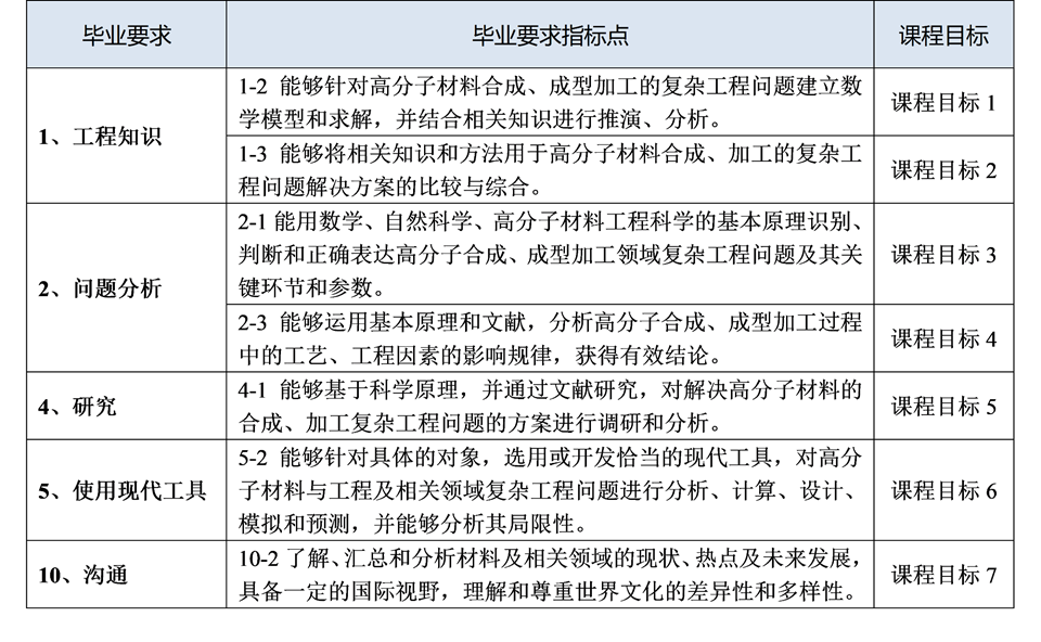 5、能综合运用本课程和其它课程知识,正确表述高分子结构-性能相关的工程问题,并能借助文献调研,比较、分析通过优化工艺条件提高高分子材料性能等工程问题的解决方案。